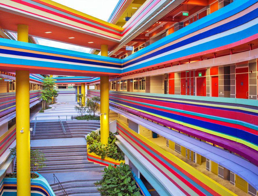 2016-njy ýylda Singapurda gurlan bu «Älemgoşar mekdep» çagalaryň ünsüni özüne çekýär, sebäbi mekdebiň ähli binagärlik keşbi älemgoşaryň açyk reňkleri bilen beslenendir. Okuwçylar bu mekdepde diňe bir bilim almak bilen çäklenmän, eýsem, uzak gün galmagy hem kyn görmeýärler. Binanyň ähli gurluşyk desgalary adaty reňkler bilen reňklenendir. Açyk hem täsin reňkler mekdebiň howlusyny has hem giň görkezýär. Bu täsin reňkler diňe bir okuwçylaryň däl, eýsem ene-atalaryň hem ünsüni özüne çekýär.