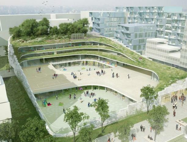 Dünýäde iň «ýaşyl» mekdep Parižiň eteginde 2014-nji ýylda gurlupdyr. Bu täsin taslama «Chartier Dalix» diýen fransuz binagärlik ussahanasynda häzirki zaman Fransiýanyň tebigy görnüşinde özboluşlylyk döretmek maksady bilen işlenilip düzülipdir. Mekdebiň binasy ýaşyl üçekler bilen bezelipdir. Taslamanyň esasy aýratynlygy demir betondan ýygnalan bloklardan düzülen dürli ölçegli diwarlar bolup durýar. Bloklardan düzülen ägirt kompozisiýa şeýle görnüşde düzülen. Ýagny ýakyn geljekde onuň jaýryklarynda otjagazlar öser ýa-da kiçijik guşlar höwürtge gurnar.