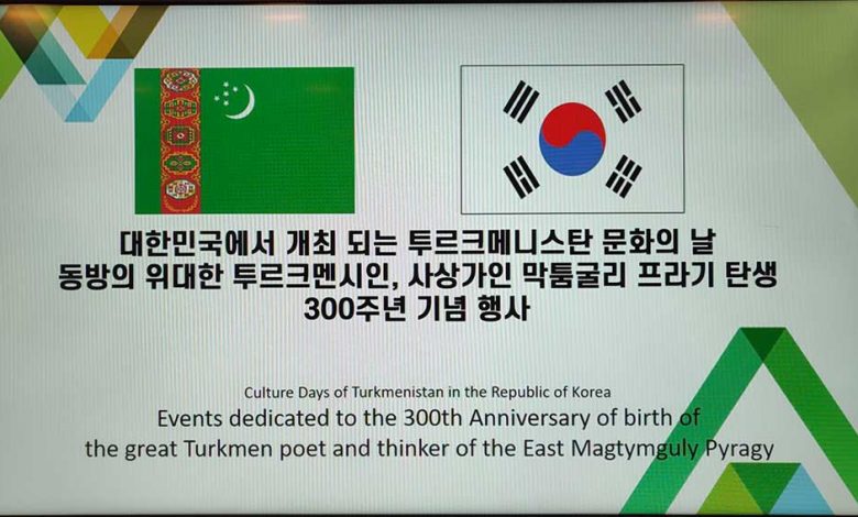 29-njy martda Koreýa Respublikasynyň paýtagty Seul şäherinde Türkmenistanyň Medeniýet günleriniň açylyş dabarasy boldy. Türkmen-koreý dostlukly gatnaşyklarynyň taryhynda täze sahypany açjak Medeniýet günleriniň çäklerinde ikitaraplaýyn iş duşuşyklaryny geçirmek hem meýilleşdirilýär.